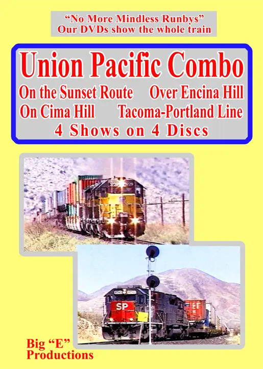 Big E Productions gives us every train, the whole train, every time. This combo includes: “Union Pacific’s Sunset Route”, Union Pacific’s Encina Hill”, “Union Pacific on Cima Hill” and UP and BNSF on the Tacoma-Portland Joint Line. 4 DVDs, 4 Shows, 5 hours 55 minutes.